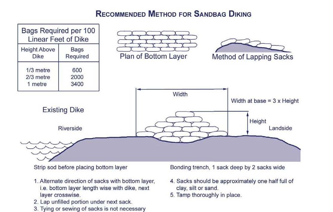 - Sandbagging should also focus along existing flood works or any low spots along dikes for maximum protection.