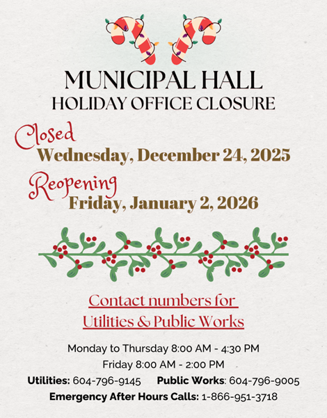 Please note that the Agassiz Bottle Depot, Public Works, and Utilities will be closed on December 25 and 26, 2025, as well as January 1, 2026.