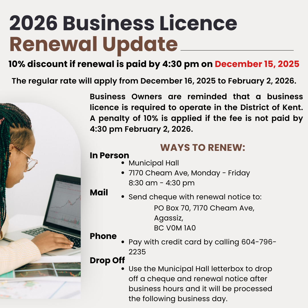 2026 Business Licence Renewals will receive a 10% discount if the renewal is paid by 4:30 pm December 15, 2025. The regular rate will apply from December 16, 2025 to February 2, 2026. A business licence is required to operate in the District of Kent, a penalty of 10% will be applied on February 3, 2026.