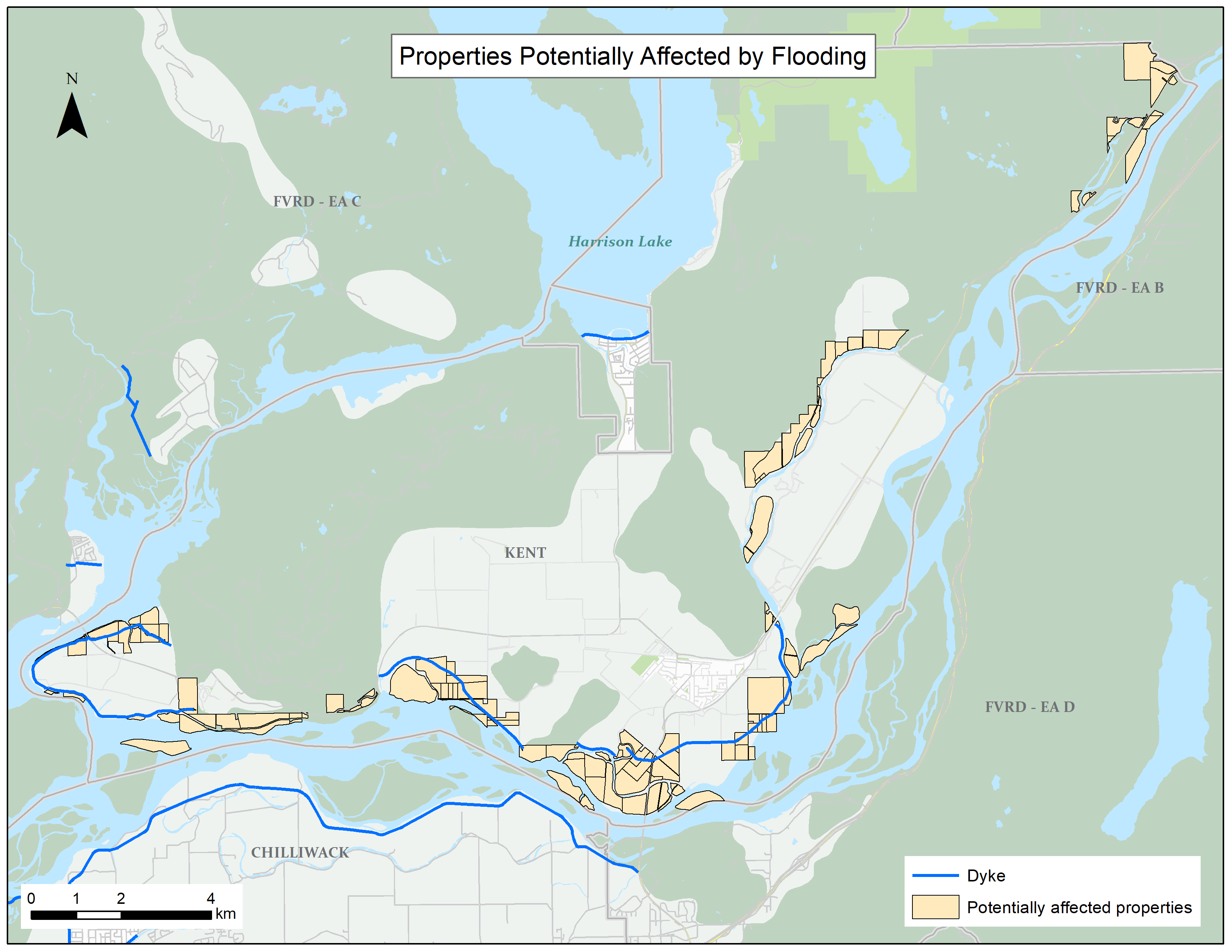 Properties located outside the dike may be impacted if water flows over the bank. The District of Kent has notified residents living on properties outside of the District’s dike system of the potential flood situation (please see the map).