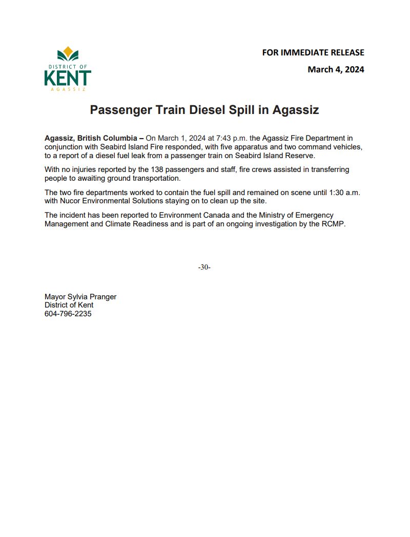 Passenger Train Diesel Spill in Agassiz