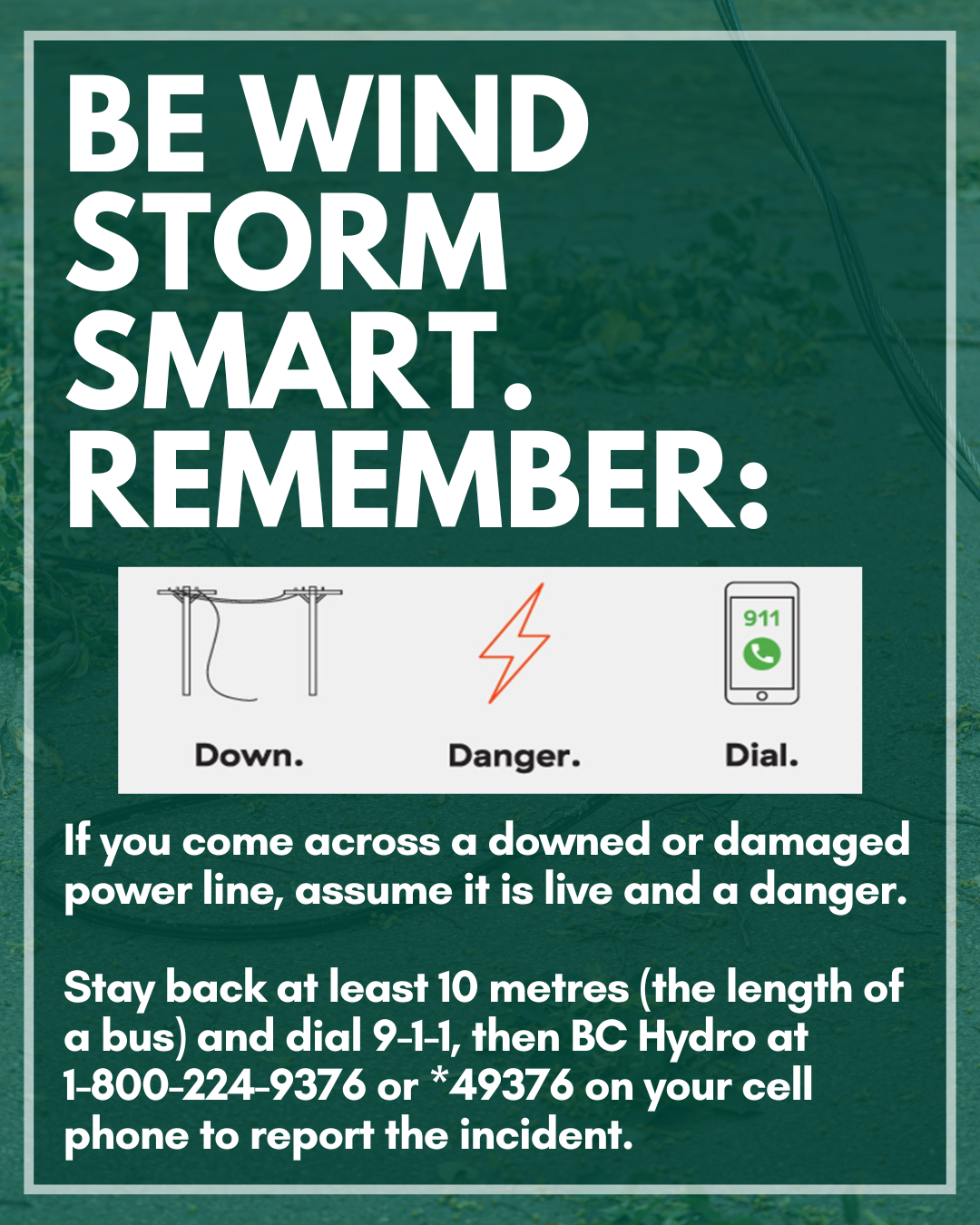 With current heavy ground saturation and an anticipated wind event on Monday, December 15, there is the potential for trees to be downed. If you come across a downed or damaged power line, assume it is live and a danger. Stay back at least 10 metres (the length of a bus) and dial 9-1-1, then BC Hydro at 1-800-224-9376 or *49376 on your cell phone to report the incident.